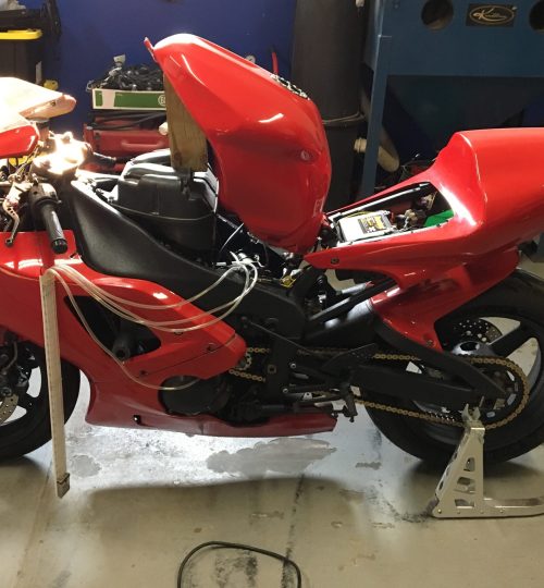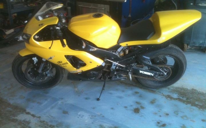 This bike started out Yamaha blue, just had to have the blue one. Since then, we've repainted this bike, white, white/orange, white/blue/grey, yellow/black, and red. Maybe next time it comes in the shop for paint it will go back to blue?